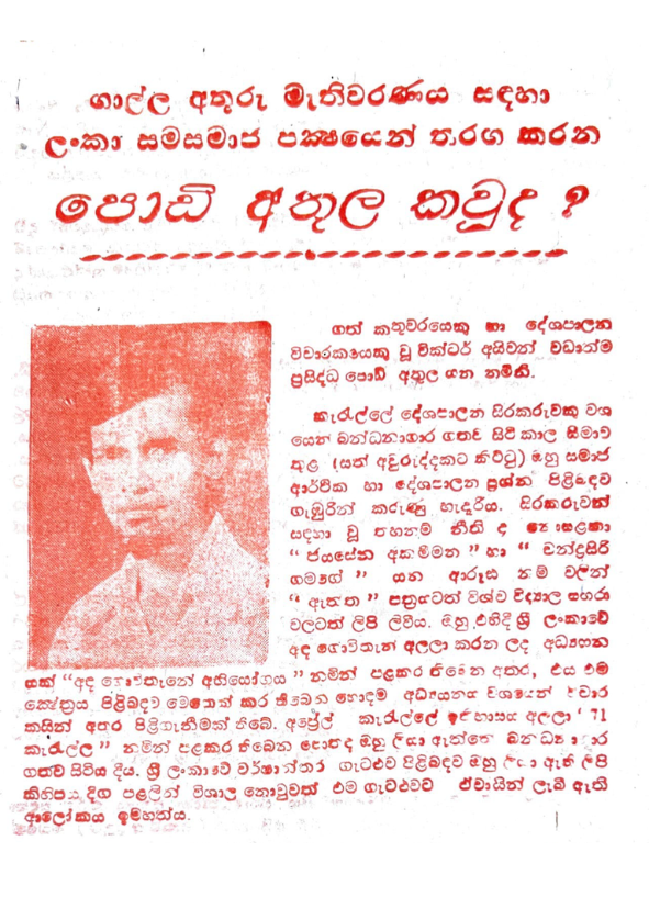 1979 ගාල්ල අතුරු මැතිවරණයේදී ලංකා සමසමාජ පක්ෂයේ අපේක්ෂකයා ලෙස තරග කළ වික්ටර් අයිවන් හෙවත් ‘පොඩි අතුල’ මහතා වෙනුවෙන් නිකුත් කරන ලද නිල මැතිවරණ පත්රිකාවයි. මෙමගින් ඔහුගේ මුල්කාලීන දේශපාලන දිවිය, 1971 අප්රේල් කැරැල්ලේදී ඔහු ඉටුකළ සුවිශේෂී කාර්යභාරය සහ සිරගතව සිටියදී කළ ශාස්ත්රීය අධ්යයනයන් පිළිබඳ වැදගත් ඓතිහාසික තොරතුරු රැසක් ගෙනහැර දක්වයි.